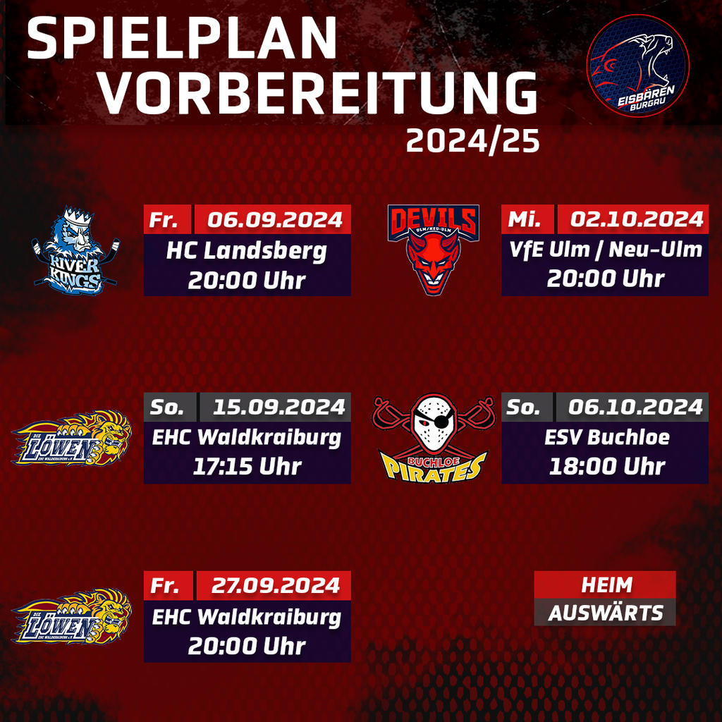 Zum Auftakt reist am 6. September der HC Landsberg nach Burgau. Die Riverkings spielten nach drei Jahren in der Oberliga in der vergangenen Saison wieder in der Bayernliga und beendeten die Hauptrunde hierbei auf dem 7. Platz. In den Playoffs erreichte unser letztjähriger Kooperationspartner das Viertelfinale, in dem gegen den späteren Vizemeister Peißenberg jedoch Schluss war.
