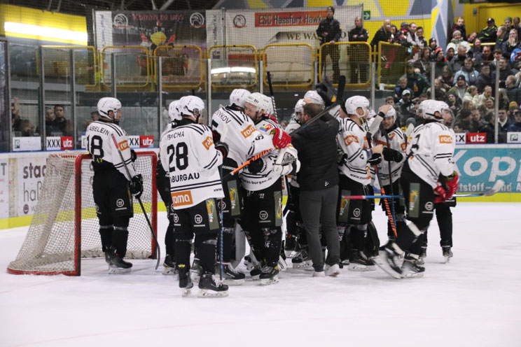 Die Mannschaft von Trainer Ivan Horak nahm sich das zu Herzen und drängte mit Beginn des letzten Spielabschnitts aufs ESV-Tor. Jakub Sramek und Samy Paré waren erfolgreich und plötzlich war der Drei-Tore-Vorsprung der Eisbären dahingeschmolzen. Die Treffer fielen in der 43. und der 46. Minute. An die jetzt folgenden 14 Minuten bis zur Schlusssirene wird sich jeder Eisbär, egal ob er als Spieler auf dem Eis stand, an der Bande als Trainer oder Betreuer oder als Fan auf der Tribüne dabei war, noch sehr lange erinnern. Die jetzt frenetisch angefeuerten Gastgeber drängten vehement auf das Tor von Philipp Schnierstein. „Ausgleich, Ausgleich, Ausgleich“ schallte es von den Tribünen. Doch Schnierstein und seine Vorderleute kämpften um jeden Zentimeter Eis, warfen sich in Schüsse, nahmen harte Checks an und verteidigten ihren knappen Vorsprung mit Leidenschaft. Der Burgauer Torwart zeigte mit sensationellen Paraden seine Extraklasse. Die Hassfurter waren der Verzweiflung nahe, doch der Goalie hielt seinen Kasten mit stoischer Ruhe sauber. Als dann die Schlusssirene ertönte, kannte der Jubel der Eisbären und ihrer Anhänger keine Grenzen mehr. Die Jubellieder, fanden im legendären Gesang: Finale, oh, oh, Finale oh, oh ihren Höhepunkt. Nach mehreren Ehrenrunden wurden die Spieler dann in die Kabine verabschiedet.